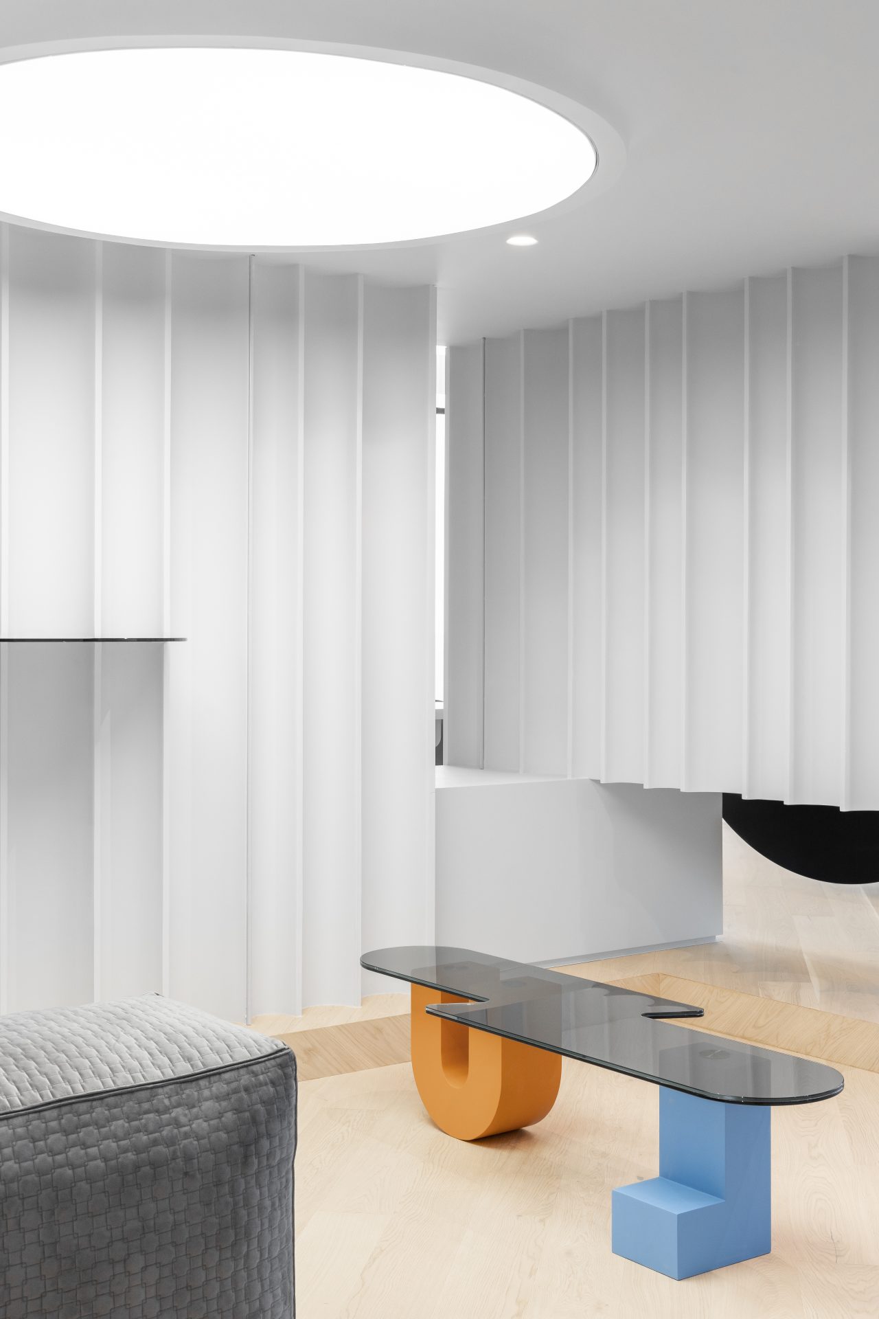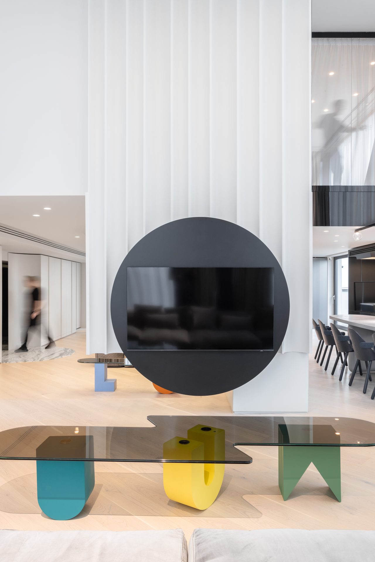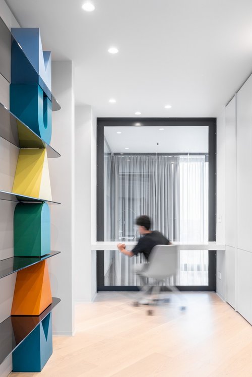 One of the most original features of the project is the geometric elements made of Kerrock material, which are placed on glass shelves. These colourful components, designed in a variety of shapes, add dynamism and a contemporary character to the space. Their flexibility allows them to blend perfectly with different design styles, while bringing a touch of playfulness and boldness.