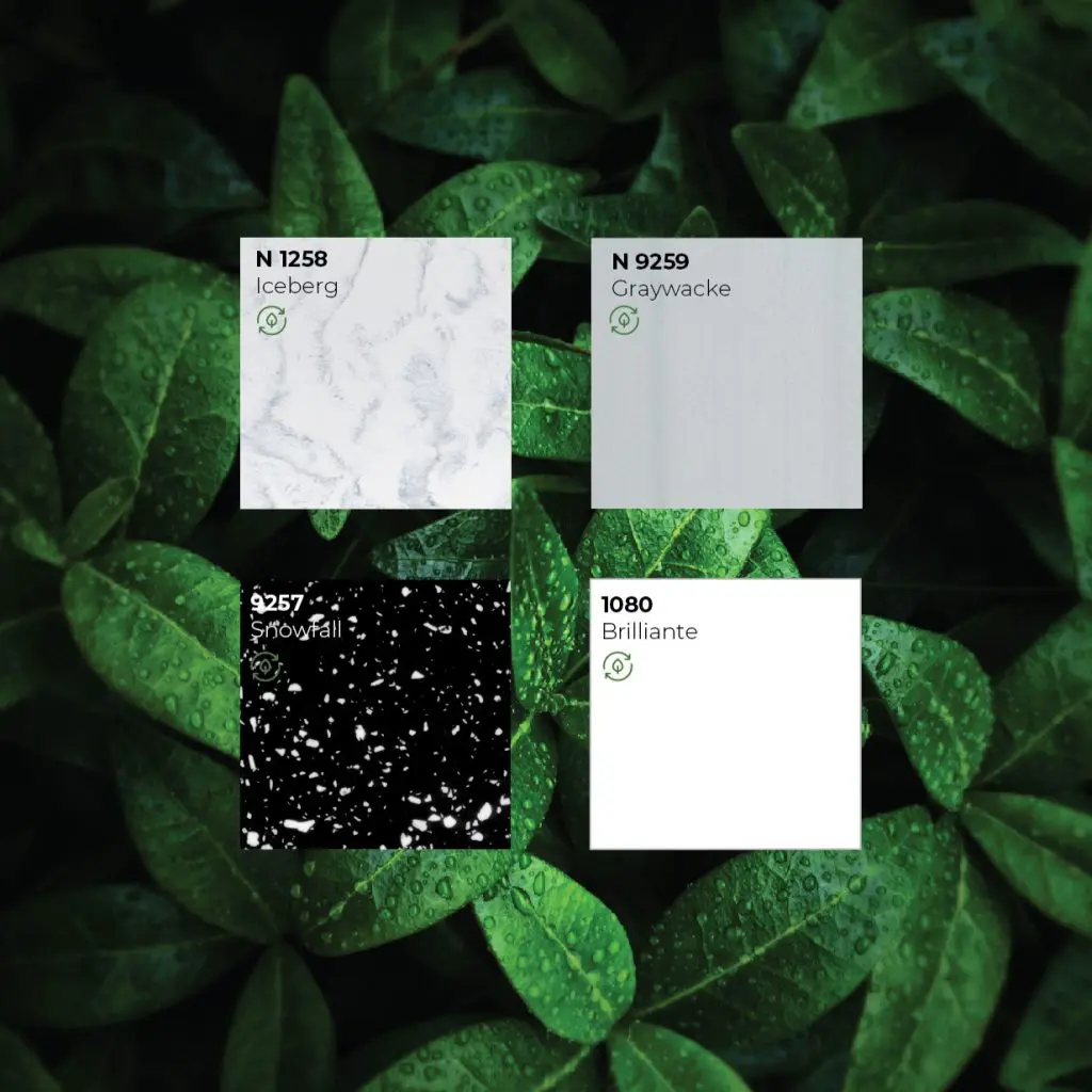 We recycle leftover Kerrock material to make new sheets and other products. At Kolpa, we mill, screen and use the waste offcuts of certain colours for recycled Kerrock sheets, which reduces the carbon footprint without affecting quality. The RECYCLED CONTENT certificate confirms our ecological orientation. Recycled Kerrock sheets contain a minimum of 8% recycled content, in accordance with ISO 14021, making them an environmentally friendly choice in a wide range of projects. These colours contain at least 8% recycled materials and meet ISO 14021 standards, further confirming their suitability for environmentally responsible projects.