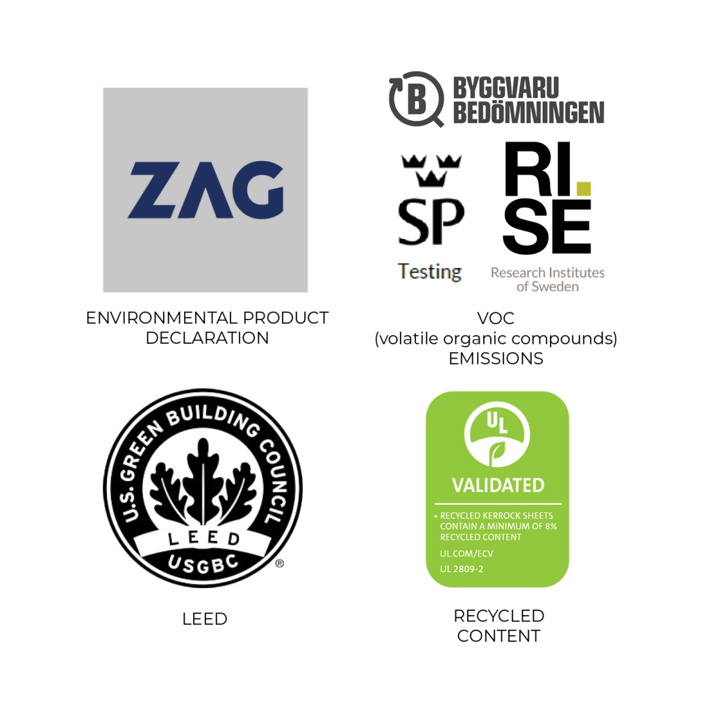 • The adhesive used in glueing Kerrock products hardens completely and therefore does not release any volatile organic compounds at the end user.